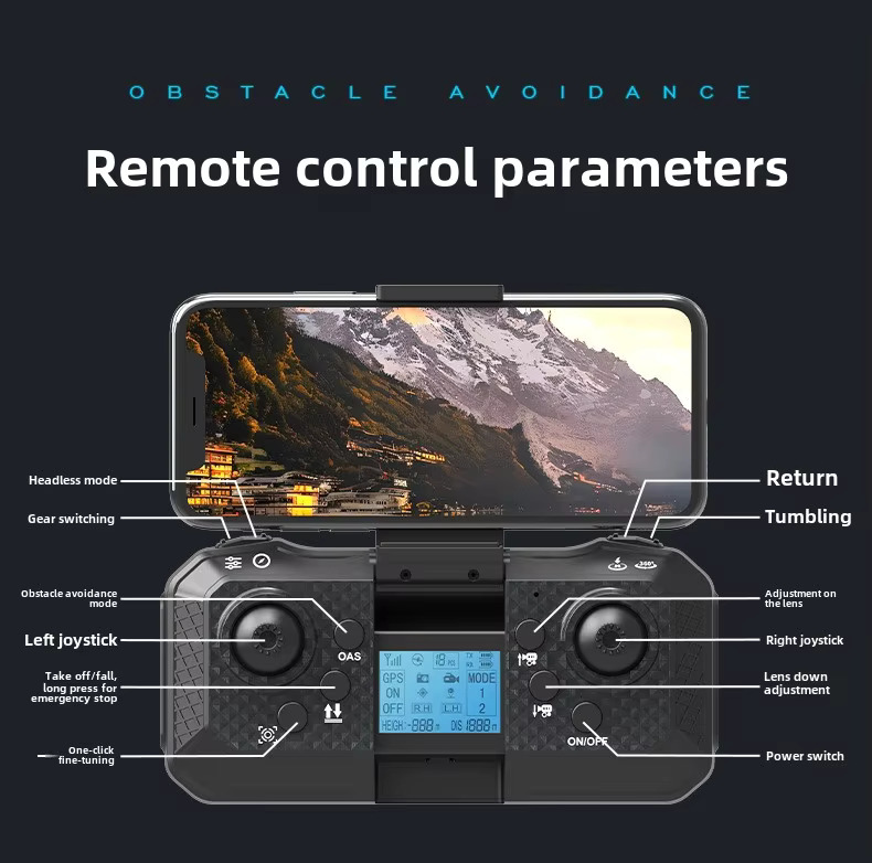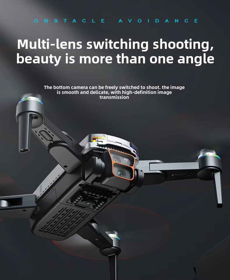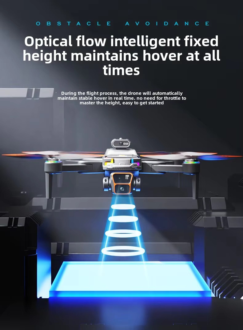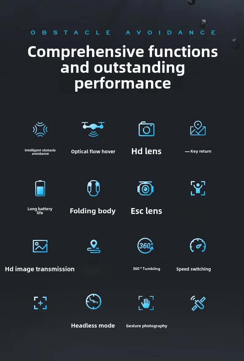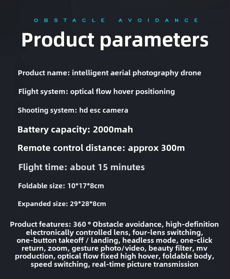 Features: brushless motor, electric camera, rising and falling, left and right rotation, forward, backward, left and right flying, fast and slow control, headless mode, optical flow fixed high and fixed points, gesture photography, gesture recording, follow-up functions. Dual camera switching